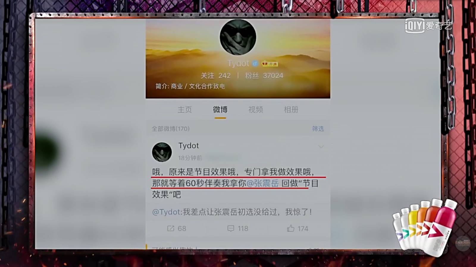 TY发微博剧组为了节目效果故意用他的尊严来做文章,因此给整个评委组和导演组很不好的印象,至少觉得不尊重人,但相反,是否考虑到学员的尊严,毕竟自以为小有名气嘛,更何况是说唱这么张狂的行业。